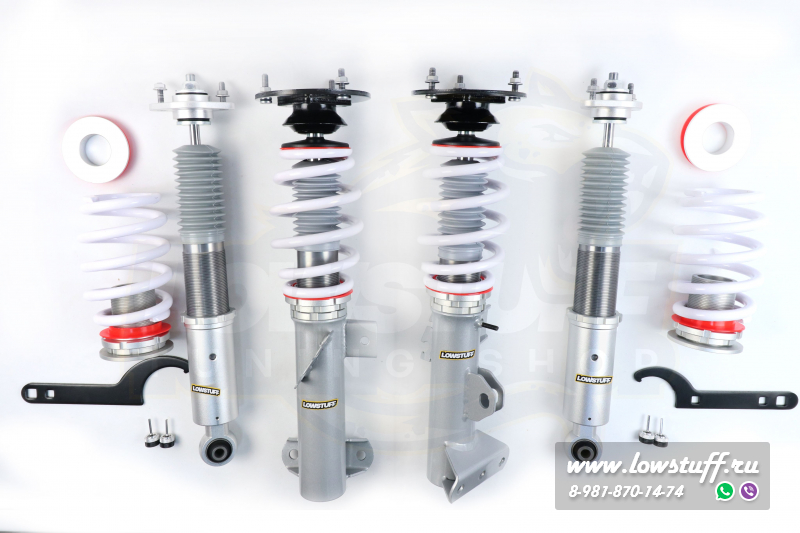 Серия кoйловepов LOWSTUFF EVO-4 - комплект винтовой подвески с фултaп конструкцией имеет независимые настройки высоты (нижний сапог, стакан), преднатяг пружины, сжатие/отбой амортизатора 32 положения. Fulltap конструкция позволяет менять высоту автомобиля ( клиренс) без изменения преднатяга пружины.