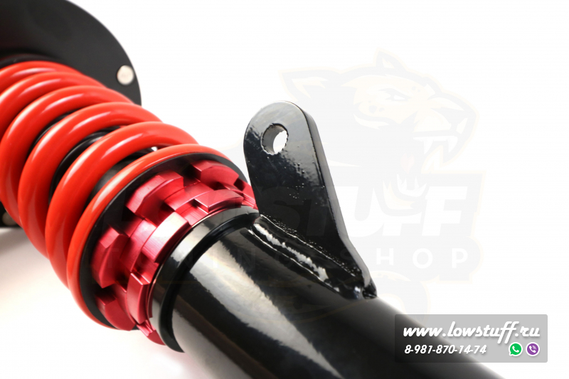 - Максимальная свобода выбора настроек подвески: возможность независимой регулировки высоты автомобиля без изменения преднатяга основной пружины, а так же регулировка отбоя амортизатора