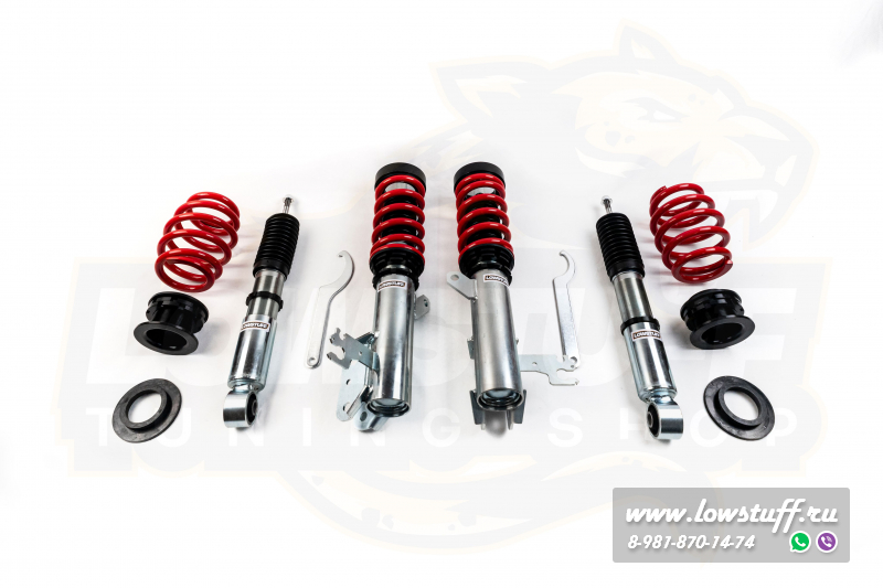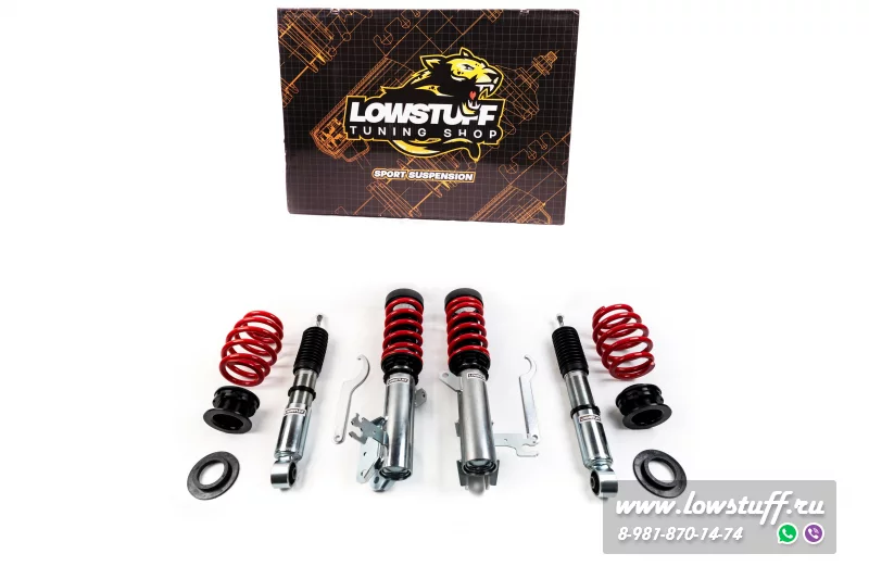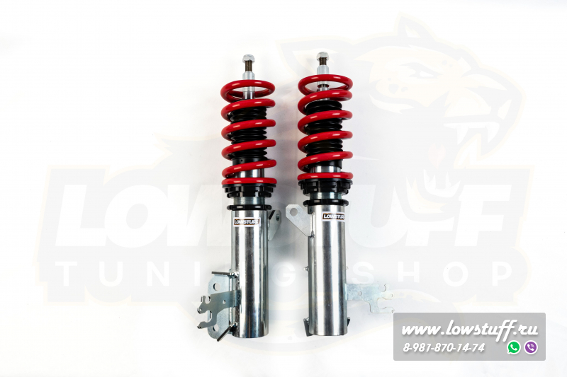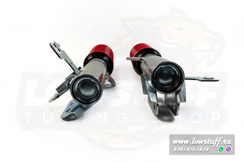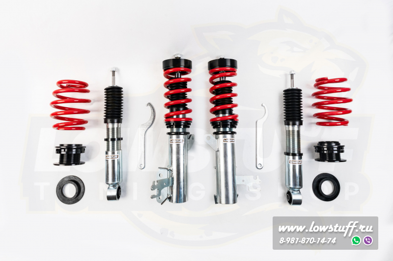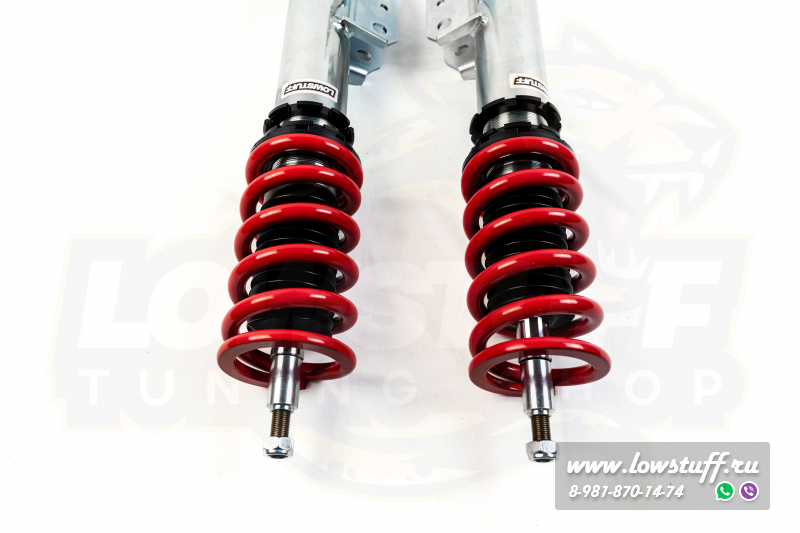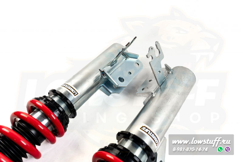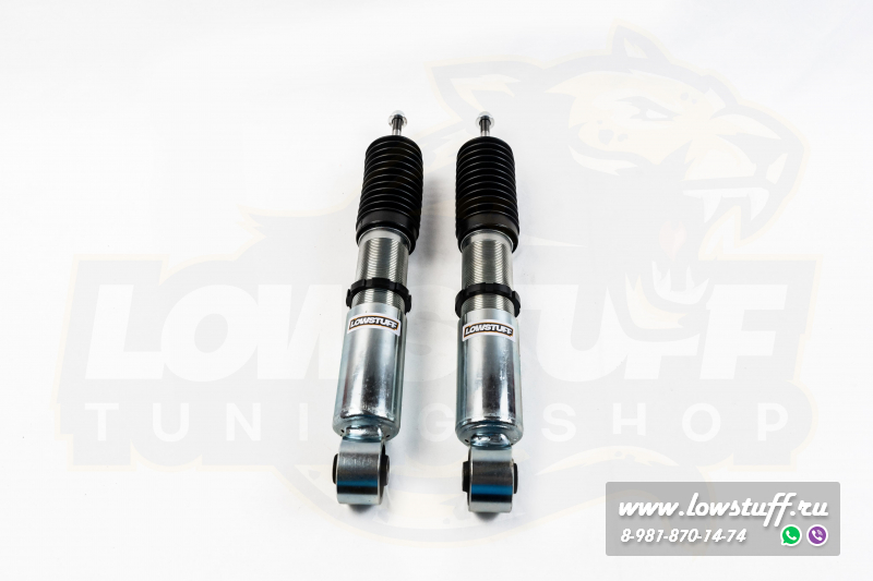 Комплект койловеров LOWSTUFF EVO-II представляет собой более продвинутую версию недорогих винтовых подвесок с независимой регулировкой высоты и преднатяга. В отличии от известных всем Jom Redline, TA-TECHNIX позволяет регулировать высоту автомобиля непосредственно в нижнем сапоге, без изменения преднатяга пружины - средняя ступень между бюджетными вариантами и койлами фултап конструкции.