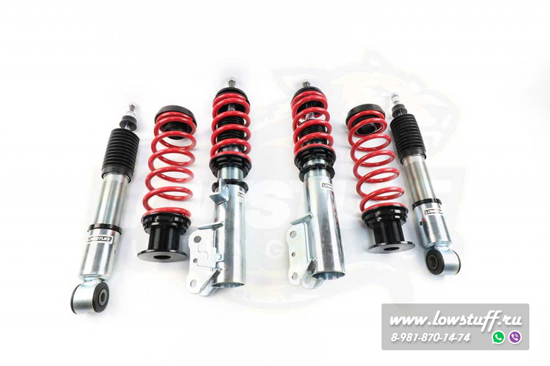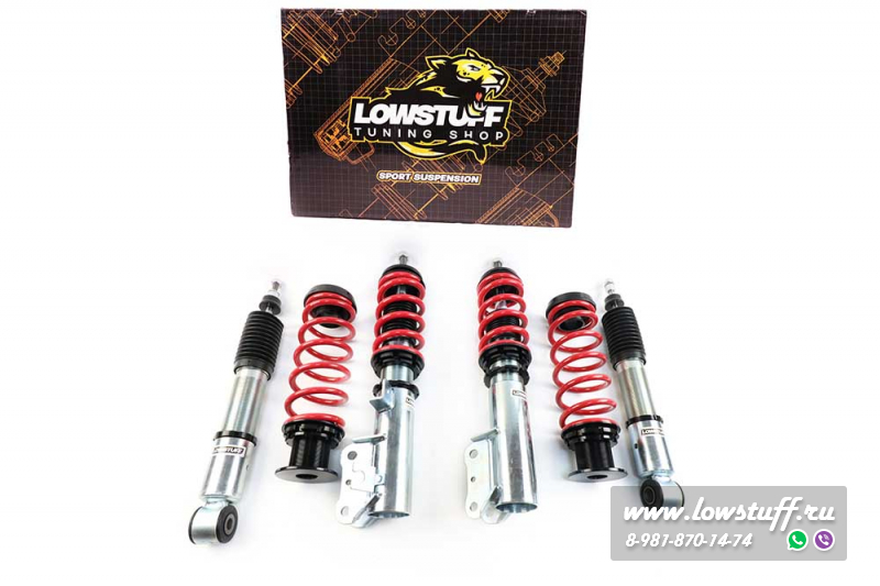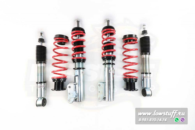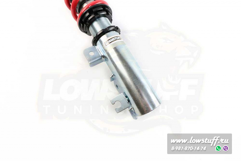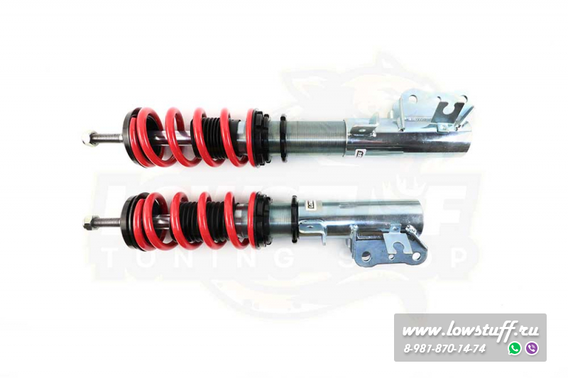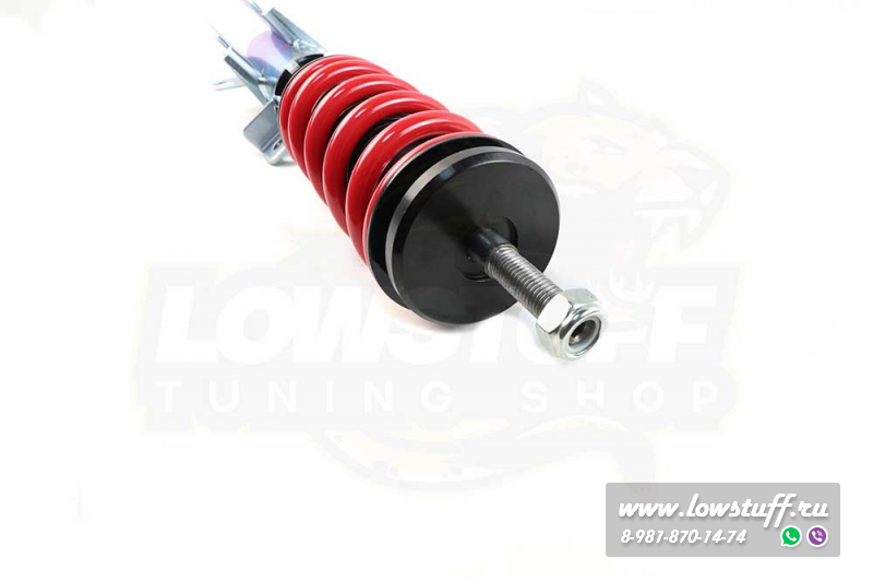 Комплект койловеров LOWSTUFF EVO-II представляет собой более продвинутую версию недорогих винтовых подвесок с независимой регулировкой высоты и преднатяга. В отличии от известных всем Jom Redline, TA-TECHNIX позволяет регулировать высоту автомобиля непосредственно в нижнем сапоге, без изменения преднатяга пружины - средняя ступень между бюджетными вариантами и койлами фултап конструкции.